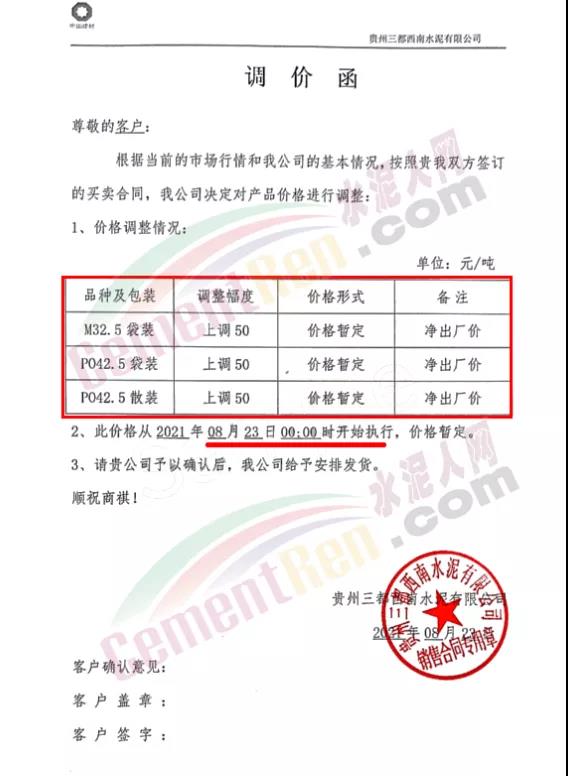 貴州從江明達水泥有限公司通知,由于煤炭材料價格持續(xù)上漲、限電運行、錯峰生產(chǎn)等,造成水泥生產(chǎn)成本不斷增加,經(jīng)公司研究決定,自8月23日7時起公司將各品種、標號袋裝、散裝水泥出廠價上調(diào)50元/噸。價格調(diào)整后,如繼續(xù)安排車輛到公司提貨,則視為確認此次價格調(diào)整。