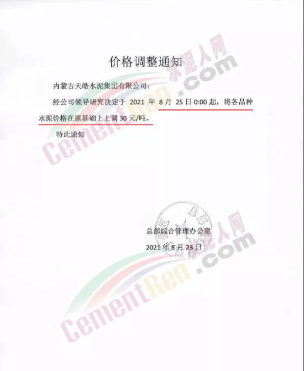 總部綜合管理辦公室通知內(nèi)蒙古天皓水泥集團有限公司稱,經(jīng)公司領(lǐng)導(dǎo)研究決定于8月25日0時起,將各品種水泥價格在原基礎(chǔ)上上調(diào)30元/噸。