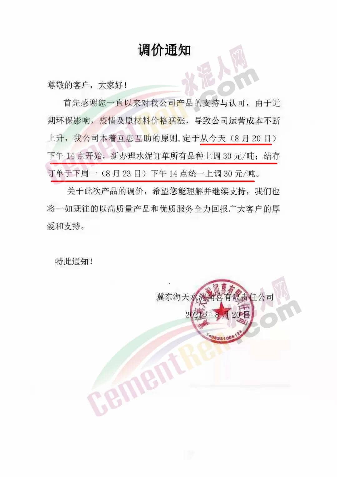 冀東海天水泥聞喜公司通知由于近期環(huán)保影響以及原材料價格猛漲,導致公司運營成本不斷上升,本著互惠互助的原則,定于從8月20日下午14點開始,新辦理水泥訂單所有品種上調30元/噸;結存訂單于8月23日下午14點統(tǒng)一上調30元/噸。
