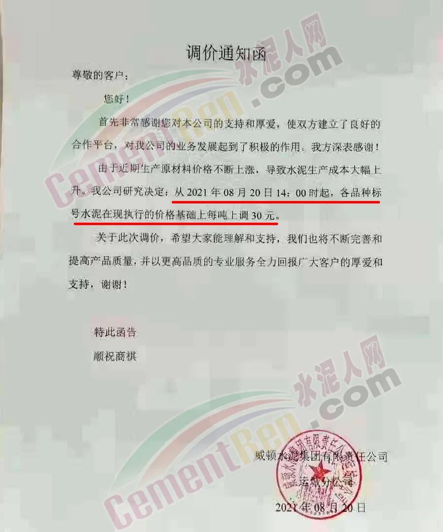 威頓水泥集團有限責任公司通知,由于近期生產原材料價格不斷上漲,導致水泥生產成本大幅上升。經公司研究決定從2021年8月20日14時起,各品種標號水泥在現執(zhí)行的價格基礎上上調30元/噸。