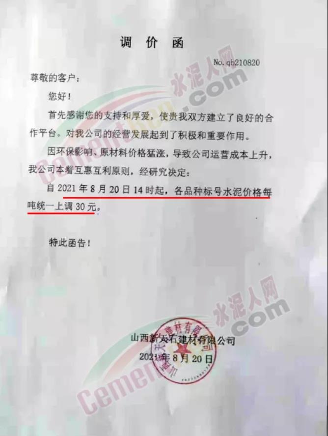 山西新天石建材有限公司通知因環(huán)保影響、原材料價格猛漲,導致公司運營成本上升,我公司本著互惠互利原則,經研究決定自2021年8月20日14時起,各品種標號水泥價格統(tǒng)一上調30元/噸。