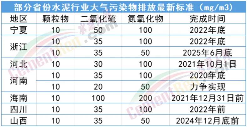 今年以來,寧夏、浙江、河北、河南、海南、四川、山西等水泥大省及部分地區(qū),再次明確了本地的超低排放指標。對氮氧化物的限值,有的已嚴到50mg/m3以下。