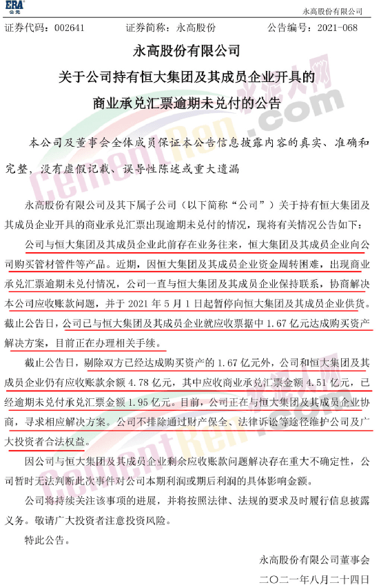 日前,永高股份表示,因恒大集團及其成員企業(yè)資金周轉困難,出現(xiàn)商業(yè)承兌匯票逾期未兌付情況,公司一直與恒大集團及其成員企業(yè)保持聯(lián)系,協(xié)商解決本公司應收賬款問題,并于2021年5月1日起暫停向恒大集團及其成員企業(yè)供貨。