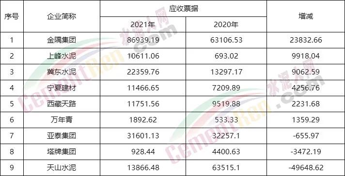 從近期水泥板塊上市企業(yè)發(fā)布的中報數(shù)據(jù)來看,9家上市公司有6家企業(yè)應收票據(jù)金額較上年同期有所增加,其中金隅集團2021年中報應收票近8.7億,同比2020年中報增長約2.4億,上峰水泥2021年中報應收票約1.1億,上年中報應收票僅693.02億,應收票據(jù)增加近1億元。以水泥為主業(yè),曾經(jīng)的“巨虧”冀東水泥應收票據(jù)增長9062.59萬元。