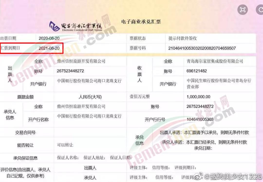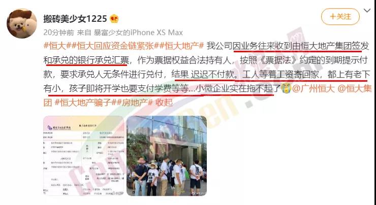 日前,網(wǎng)友“搬磚美少女1225”在社交平臺發(fā)布消息稱“我公司因業(yè)務往來收到由恒大地產(chǎn)集團簽發(fā)和承兌的銀行承兌匯票,作為票據(jù)權益合法持有人,按照《票據(jù)法》約定的到期提示付款,要求承兌人無條件進行兌付,結果遲遲不付款。工人等著工資寄回家,都上有老下有小,孩子即將開學也要支付學費等等…小微企業(yè)實在拖不起了”。
