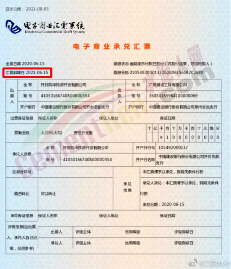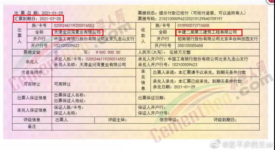 不僅恒大,另一名為“差不多的王sir”發(fā)消息稱“實地地產(chǎn)集團開出的商業(yè)承兌匯票到期也開始拒付不予供應商付款了。近期有朋友發(fā)來實地地產(chǎn)集團的子公司天津金河灣置業(yè)開出的商業(yè)承兌,到期將近一個月時間,竟然還不予解付。不知道是實地地產(chǎn)集團近期有變動還是和廣州某大地產(chǎn)一樣資金出現(xiàn)嚴重問題了。希望實地地產(chǎn)集團早日處理解決問題。”