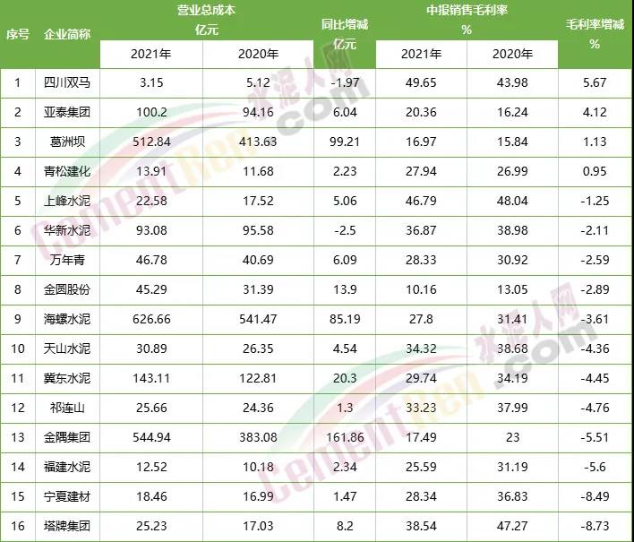 上述披露了半年報(bào)的水泥公司,平均銷售毛利率為29.50%。其中12家水泥企業(yè)毛利率較上年同期下降。塔牌集團(tuán)、寧夏建材、福建水泥、金隅集團(tuán)等4家公司上半年銷售毛利率下滑幅度在5%以上。營(yíng)業(yè)總成本方面,14家企業(yè)營(yíng)業(yè)總成本增加,其中金隅集團(tuán)營(yíng)業(yè)總成本增加161.86億至544.94億元。