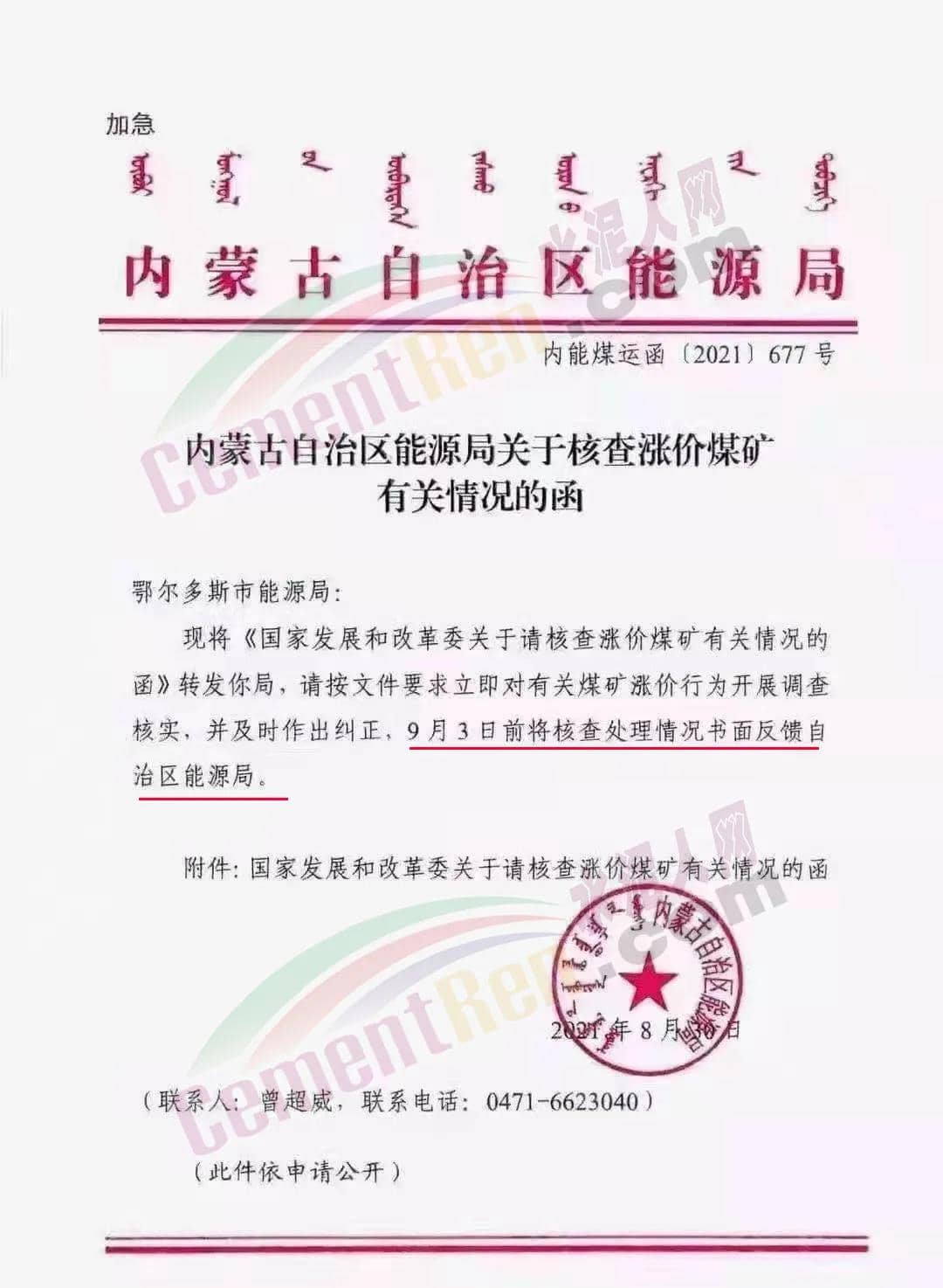 同日,內(nèi)蒙古自治區(qū)能源局發(fā)《關(guān)于核查漲價(jià)煤礦有關(guān)情況的函》給鄂爾多斯市能源局要求立即對(duì)有關(guān)煤礦漲價(jià)行為開(kāi)展調(diào)查核實(shí),并及時(shí)作出糾正,9月3日前將核查處理情況書(shū)面反饋?zhàn)灾螀^(qū)能源局。