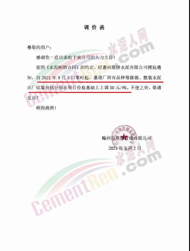 梅州塔牌營(yíng)銷有限公司通知,依照《水泥購(gòu)銷合同》的約定,經(jīng)惠州塔牌水泥有限公司授權(quán)通知,自2021年9月3日零時(shí)起,惠塔廠所有品種等級(jí)袋、散裝水泥出廠結(jié)算價(jià)格分別在現(xiàn)行價(jià)格基礎(chǔ)上上調(diào)30元/噸。