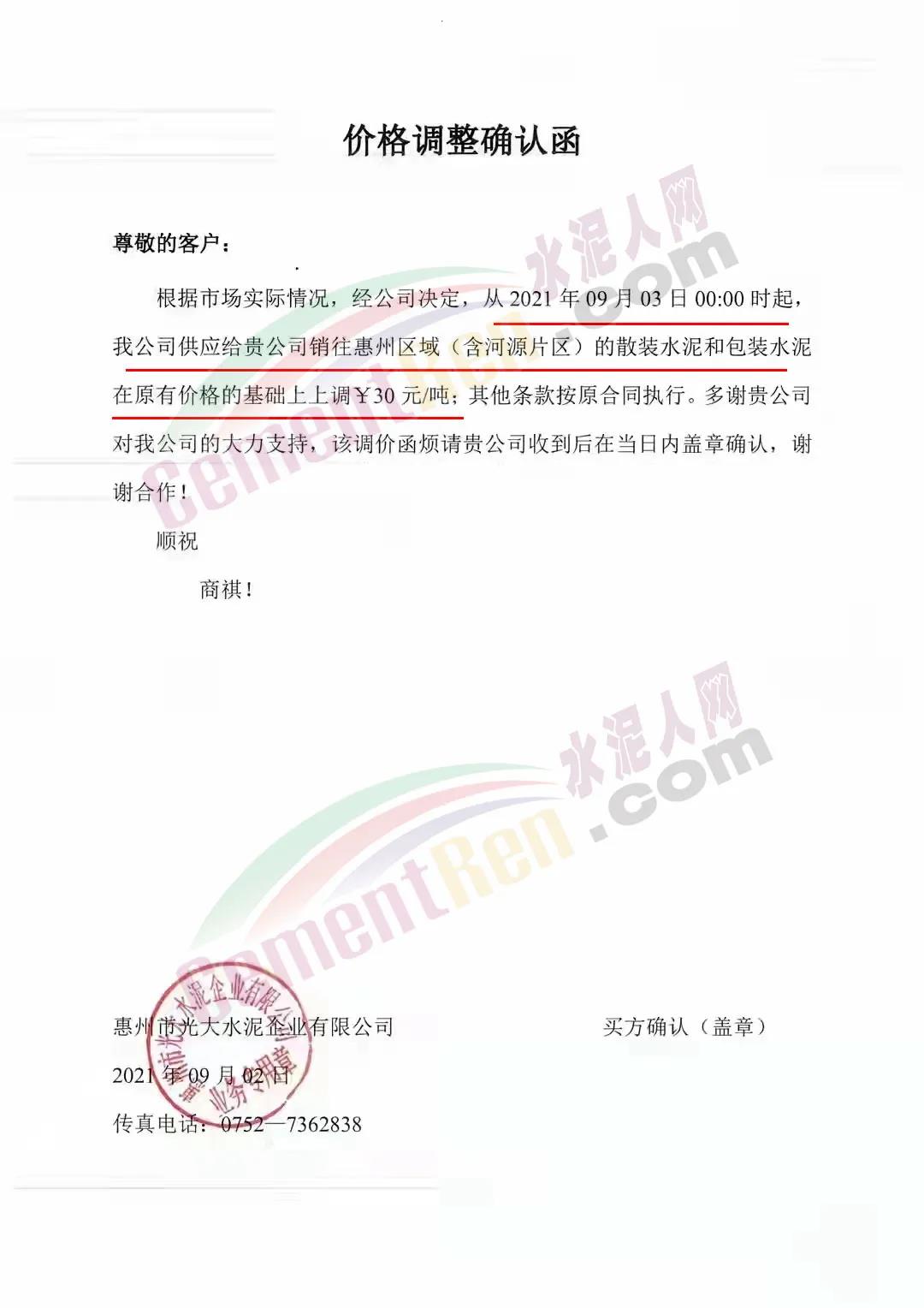 惠州市光大水泥企業(yè)有限公司通知,從2021年9月3日0時(shí)起,公司銷往惠州區(qū)域(含河源片區(qū))的散裝水泥和包裝水泥在原有價(jià)格的基礎(chǔ)上上調(diào)30元/噸。