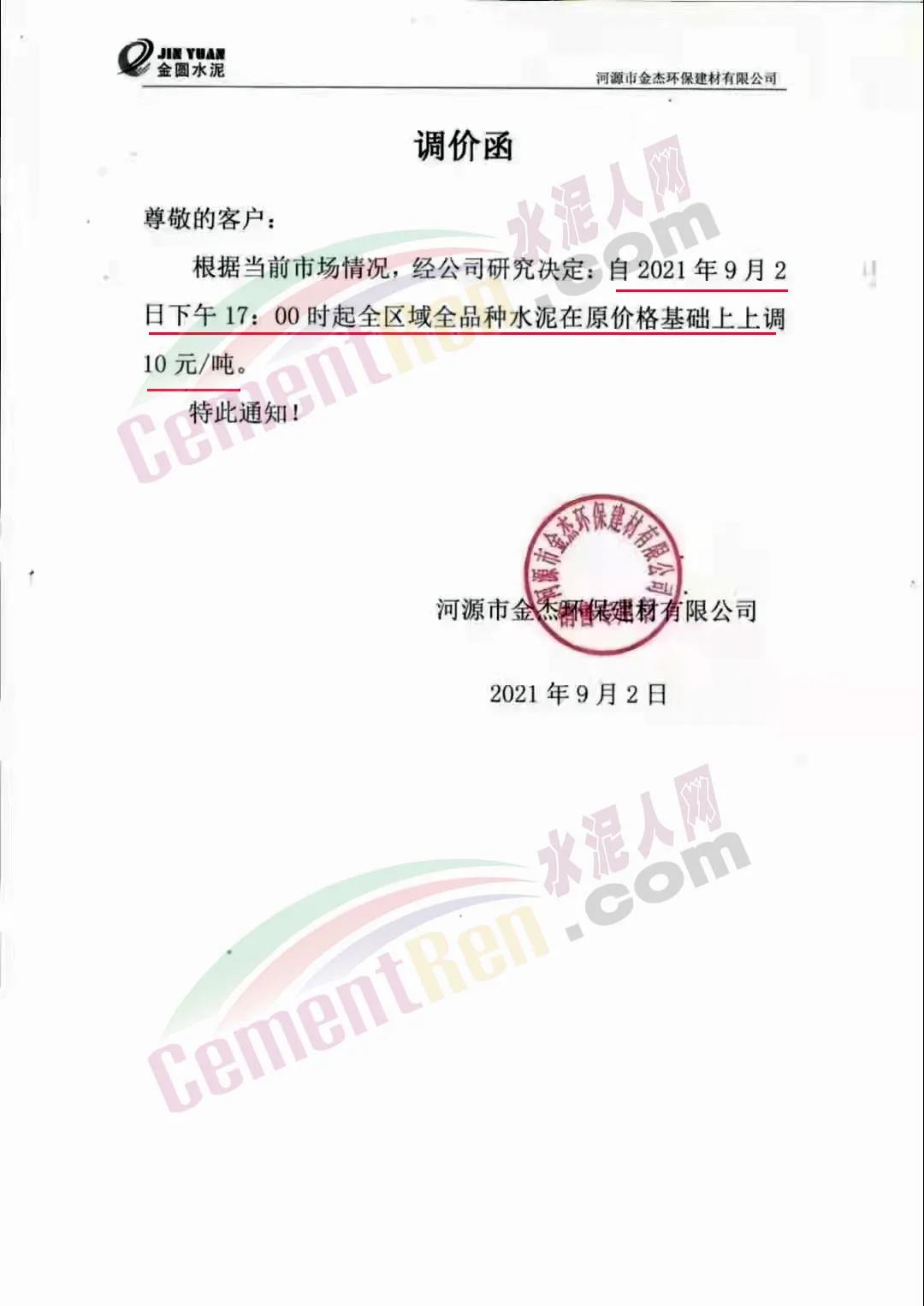 河源市金杰環(huán)保建材有限公司通知,根據(jù)當(dāng)前市場(chǎng)情況,經(jīng)公司研究決定自 2021年9月2日下午17時(shí)起全區(qū)域全品種水泥在原價(jià)格基礎(chǔ)上上調(diào)10元/噸。
