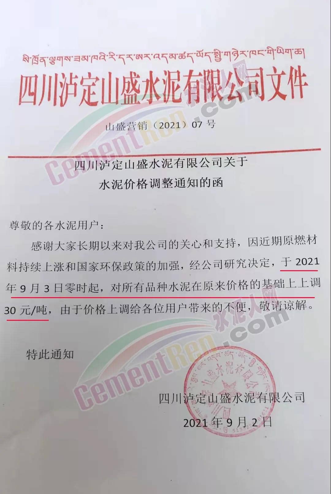 四川瀘定山盛水泥有限公司通知,因近期原燃材料持續(xù)上漲和國(guó)家環(huán)保政策的加強(qiáng),經(jīng)公司研究決定,于2021年9月3日零時(shí)起,對(duì)所有品種水泥在原來(lái)價(jià)格的基礎(chǔ)上上調(diào)30元/噸。