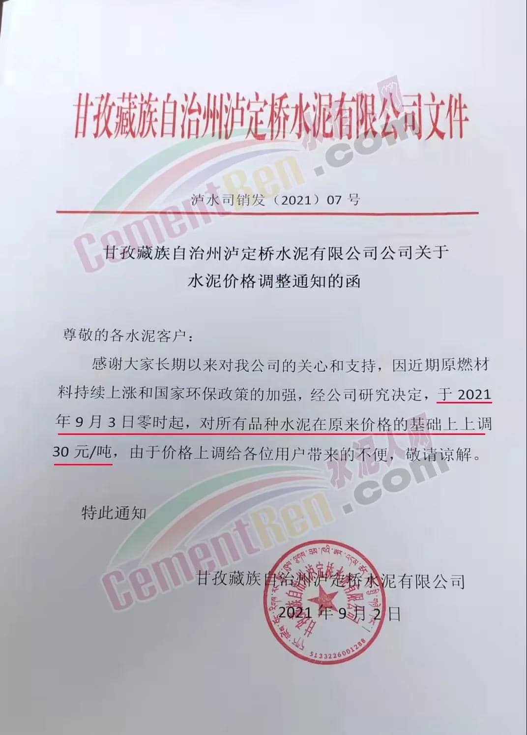 甘孜藏族自治州瀘定橋水泥有限公司通知,因近期原燃材料持續(xù)上漲和國(guó)家環(huán)保政策的加強(qiáng),經(jīng)公司研究決定,于2021年9月3日零時(shí)起,對(duì)所有品種水泥在原來(lái)價(jià)格的基礎(chǔ)上上調(diào)30元/噸。