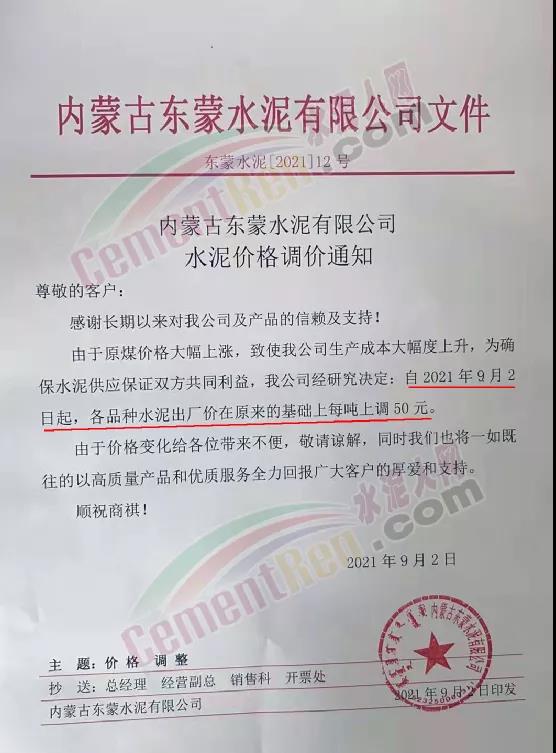 內(nèi)蒙古東蒙水泥有限公司通知由于原煤價(jià)格大幅上漲,致使公司生產(chǎn)成本大幅度上升。為確保水泥供應(yīng),經(jīng)研究決定自2021年9月2日起,各品種水泥出廠價(jià)在原來(lái)的基礎(chǔ)上每噸上調(diào)50元。