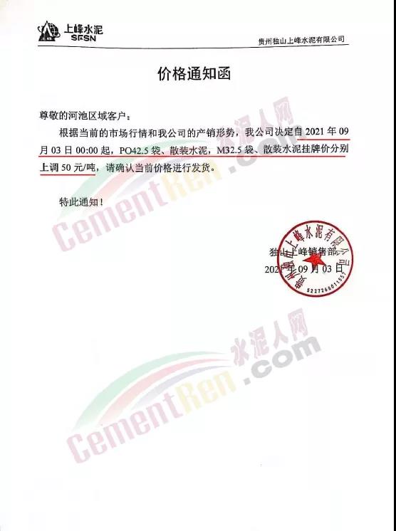 貴州獨(dú)山上峰水泥有限公司通知,根據(jù)當(dāng)前的市場(chǎng)行情和公司的產(chǎn)銷形勢(shì),公司決定自2021年9月3日0時(shí)起,PO42.5袋、散裝水泥,M32.5袋、散裝水泥掛牌價(jià)分別上調(diào)50元/噸。