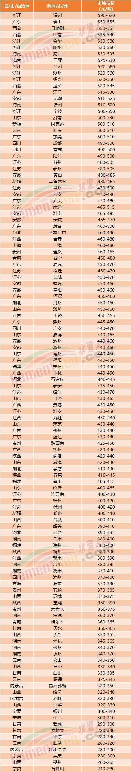 水泥人網(wǎng)信息中心數(shù)據(jù)顯示,水泥價(jià)格經(jīng)過(guò)本輪調(diào)整,各區(qū)域水泥價(jià)格均出現(xiàn)不同幅度的上漲,其中浙江溫州部分地區(qū)PO42.5散裝水泥到位價(jià)已達(dá)620元/噸。浙江麗水、金華、臺(tái)州、湖州、紹興等多區(qū)域PO42.5散裝水泥到位價(jià)已達(dá)550元/噸以上。廣東佛山地區(qū)PO42.5散裝水泥到位價(jià)已達(dá)555元/噸。