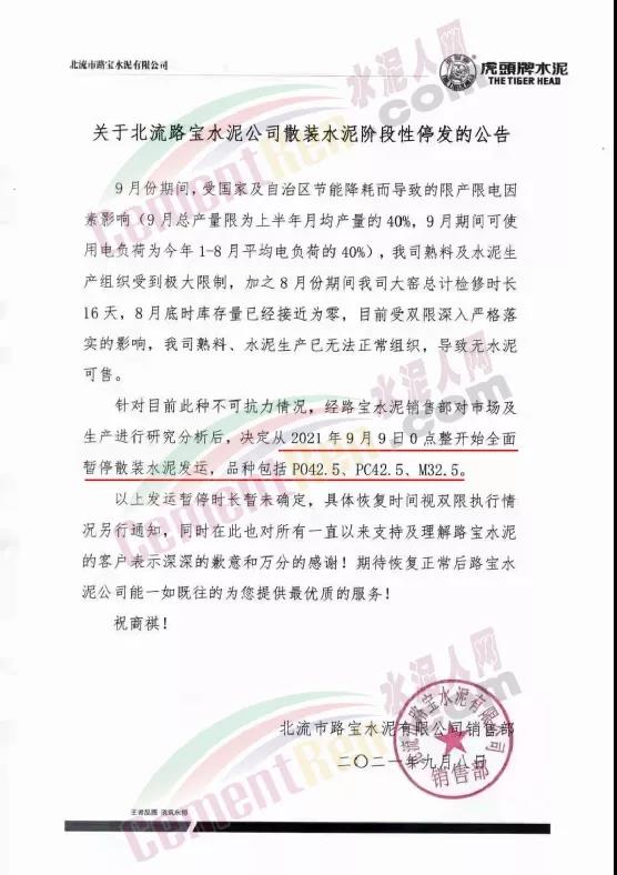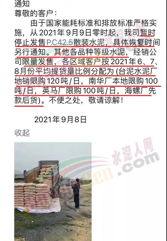 9月8日,有經(jīng)銷商通知稱,由于國家能耗標(biāo)準(zhǔn)和排放標(biāo)準(zhǔn)嚴格實施,從2021年9月9日零時起,公司暫時停止發(fā)售PC42.5散裝水泥,具體恢復(fù)時間另行通知。其他品種等級水泥,經(jīng)銷公司限量發(fā)售,各區(qū)域客戶按2021年6、7、8月份平均提貨量比例分配。其中,臺泥水泥廠地銷限購120噸/日,南華廠本地限購100噸/日,英馬廠限購100噸/日,海螺廠先款后貨。