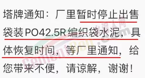 塔牌水泥通知,廠里暫時停止出售袋裝PO42.5R編織袋水泥,具體恢復(fù)時間,等廠里通知。