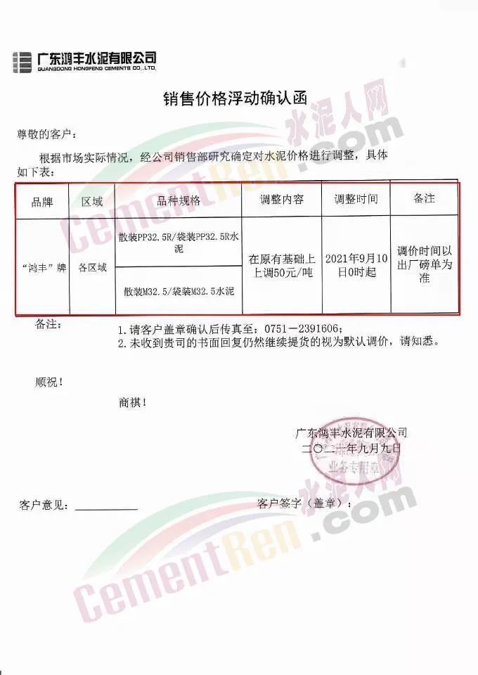 廣東鴻豐水泥有限公司通知,根據(jù)市場實際情況,經(jīng)公司銷售部研究確定自9月10日0時起,對各區(qū)域“鴻豐”牌水泥在原有基礎(chǔ)上上調(diào)50元/噸。