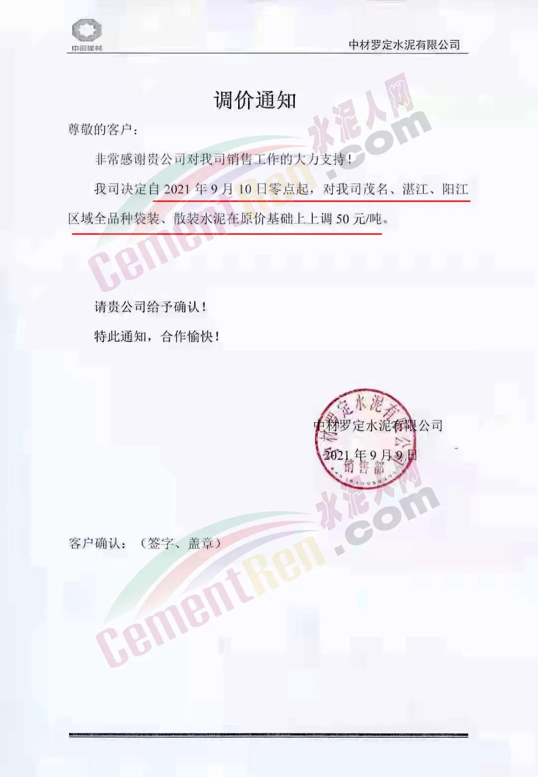 中材羅定水泥有限公司通知自9月10日零點起,對公司茂名、湛江、陽江區(qū)域全品種袋裝、散裝水泥在原價基礎(chǔ)上上調(diào)50元/噸。
