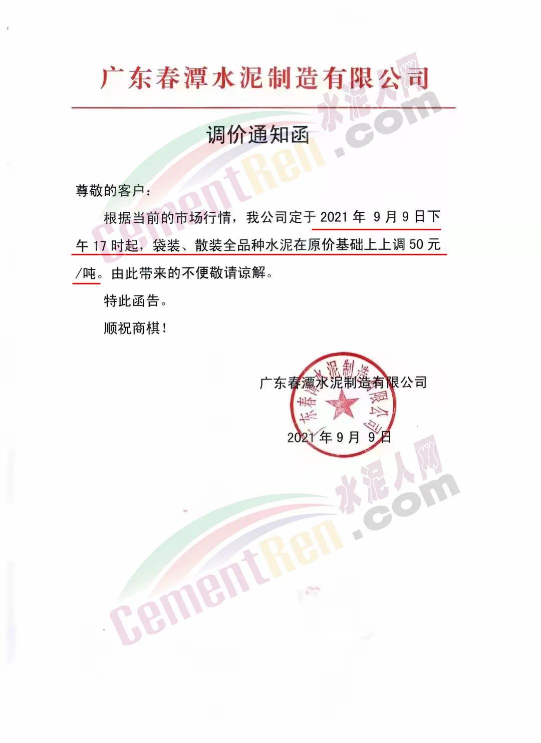 廣東春潭水泥制造有限公司通知,定于9月9日下午17時起,袋裝、散裝水泥在原價基礎(chǔ)上上調(diào)50元/噸。