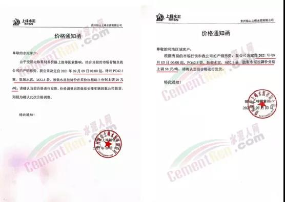 河南全省在9月3日上調(diào)30元/噸后于9月7日下午17時再次通知水泥價格上調(diào)30元/噸,本月兩次漲價,累計上調(diào)50-60元/噸。