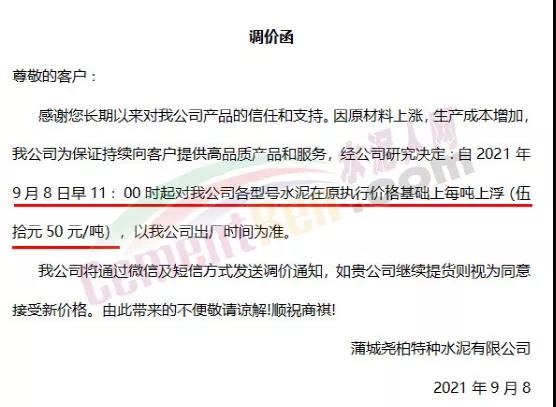 蒲城堯柏特種水泥有限公司通知因原材料上漲,生產(chǎn)成本增加,經(jīng)公司研究決定自9月8日早11時起對公司各型號水泥在原執(zhí)行價格基礎(chǔ)上每噸上浮50元/噸。