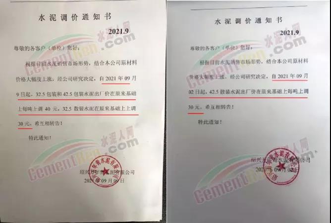浙江紹興萬年青水泥通知,自9月9日起32.5包裝和42.5包裝水泥出廠價上調(diào)40元/噸,32.5散裝水泥上調(diào)30元/噸。據(jù)水泥人網(wǎng)此前報道,9月2日紹興萬年青水泥剛剛上調(diào)了42.5散裝水泥上30元/噸。
