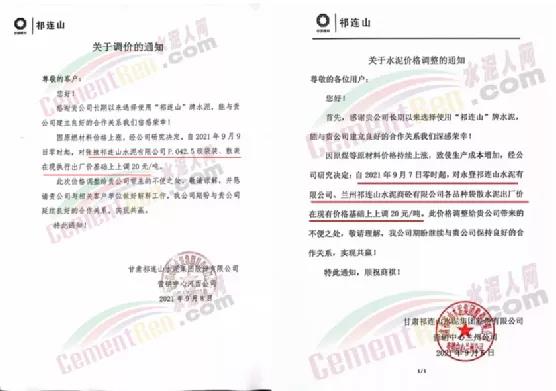 甘肅祁連山水泥集團股份有限公司營銷中心河西公司通知,因原燃材料價格上漲,經(jīng)公司研究決定,自2021年9 月9日零時起,對張掖祁連山水泥有限公司P.042.5級袋裝、散裝在現(xiàn)執(zhí)行出廠價基礎(chǔ)上上調(diào) 20元/噸。據(jù)了解,近幾日甘肅省內(nèi)主要品牌企業(yè)陸續(xù)上調(diào)水泥價格20-30元/噸。