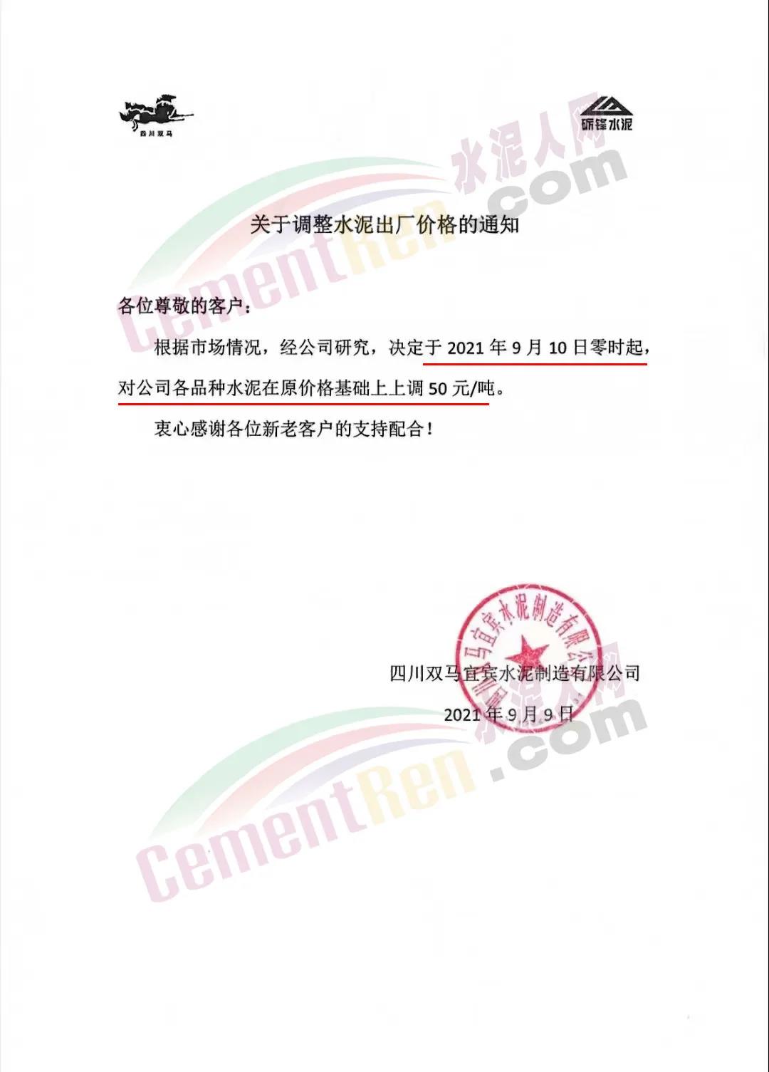 四川雙馬宜賓水泥制造有限公司通知,根據(jù)市場情況,經(jīng)公司研究決定于9月10日零時起,對公司各品種水泥在原價格基礎(chǔ)上上調(diào)50元/噸。