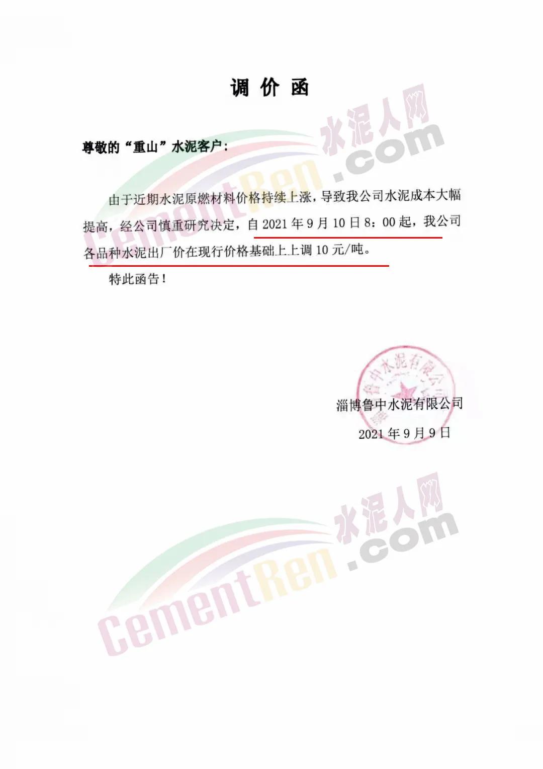 山東淄博魯中水泥有限公司通知,由于近期水泥原燃材料價格持續(xù)上漲,導(dǎo)致公司水泥成本大幅提高,經(jīng)公司慎重研究決定,自9月10日8時起,公司各品種水泥出廠價在現(xiàn)行價格基礎(chǔ)上上調(diào)10元/噸。