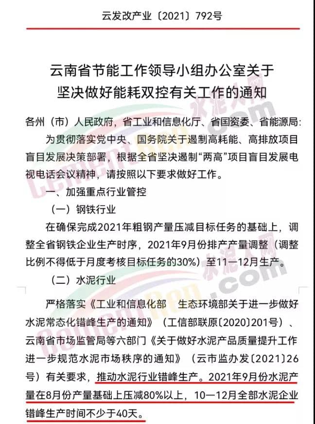 9月11日,云南省節(jié)能工作領(lǐng)導(dǎo)小組辦公室發(fā)布《關(guān)于堅(jiān)決做好能耗雙控有關(guān)工作的通知》要求水泥行業(yè):2021年9月份水泥產(chǎn)量在8月份產(chǎn)量基礎(chǔ)上壓減80%以上,10—12月全部水泥企業(yè)錯(cuò)峰生產(chǎn)時(shí)間不少于40天。