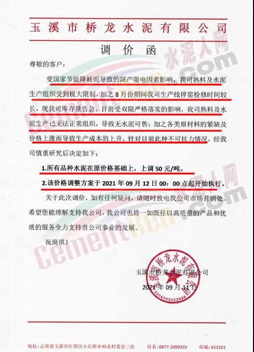 玉溪市橋龍水泥有限公司通知,受國家節(jié)能降耗而導(dǎo)致的限產(chǎn)限電因素影響,公司熟料及水泥生產(chǎn)組織受到極大限制,加之8月份期間公司生產(chǎn)線停窯檢修時(shí)間較長,現(xiàn)公司庫存量告急。目前受雙限嚴(yán)格落實(shí)的影響,公司熟料及水泥生產(chǎn)已無法正常組織,導(dǎo)致無水泥可售;加之各類原材料的緊缺及價(jià)格上漲而導(dǎo)致生產(chǎn)成本的上升,針對(duì)目前此種不可抗力情況,公司于2021年9月12日0點(diǎn)起開始上調(diào)所有品種水泥價(jià)格50元/噸。
