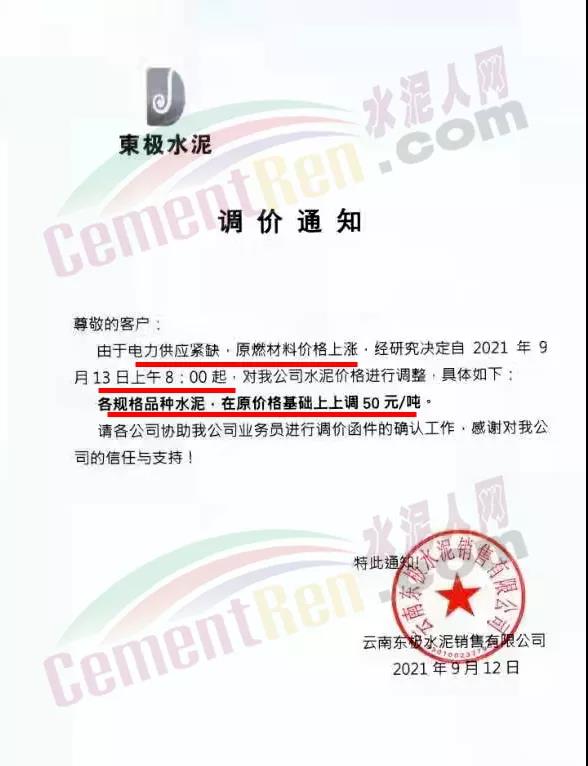 云南昆鋼嘉華水泥建材有限公司通知受近期原燃材料價(jià)格上漲及國家能耗雙控政策影響,水泥生產(chǎn)成本大幅上升,為保證正常生產(chǎn)經(jīng)營,決定于2021年9月13 日零時(shí)起,公司各品種散裝水泥價(jià)格在原價(jià)格基礎(chǔ)上上調(diào)50元/噸。