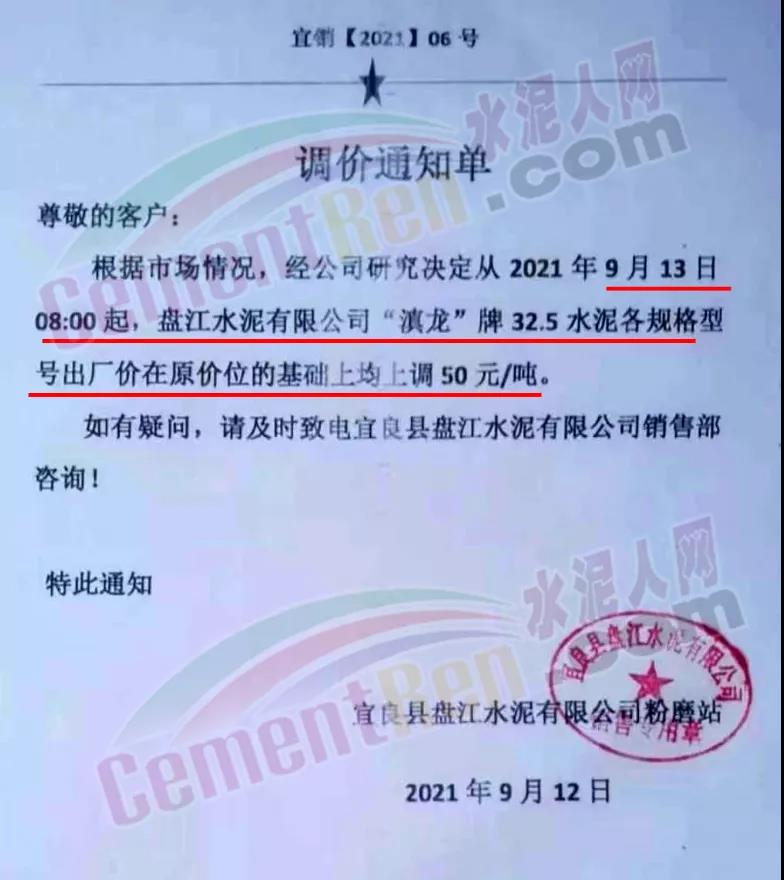 宜良縣永興水泥有限公司通知,自9月13日7時(shí)起,對(duì)各規(guī)格型號(hào)水泥出廠價(jià)上調(diào)50元/噸。