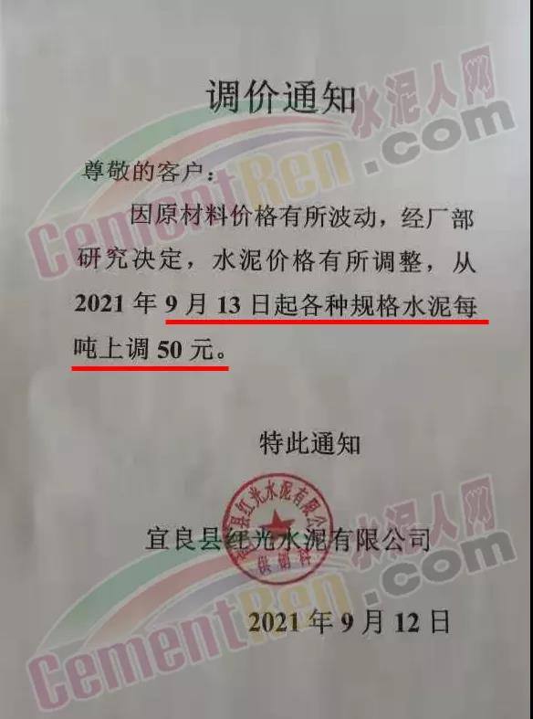 9月7日重慶綦江西南水泥、長壽西南水泥、臺(tái)泥重慶公司等9家企業(yè)通知由于原材料成本增加,所有區(qū)域所有品牌水泥價(jià)格在原執(zhí)行價(jià)格基礎(chǔ)上上調(diào)50元/噸。