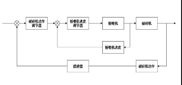 這是一個串級調節(jié)回路,主環(huán)為破碎機輸出功率調節(jié)環(huán);副環(huán)為板喂機的速度調節(jié)環(huán),實際上速度參數是作為喂料機給料率的間接參數使用的。