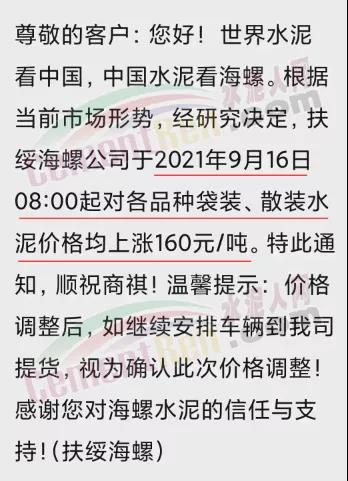 扶綏海螺通知,于9月16日8時起對各品種袋裝、散裝水泥價格均上漲160元/噸。