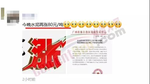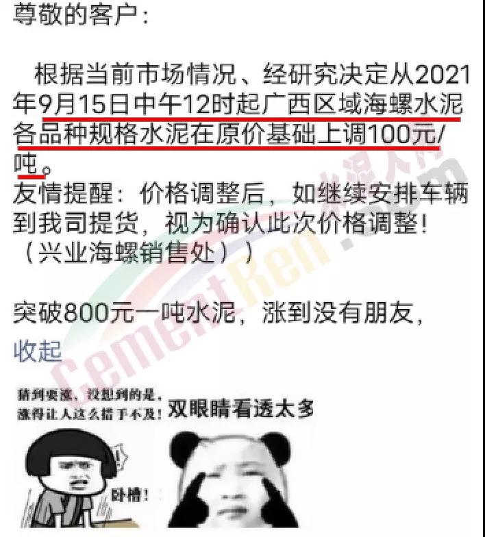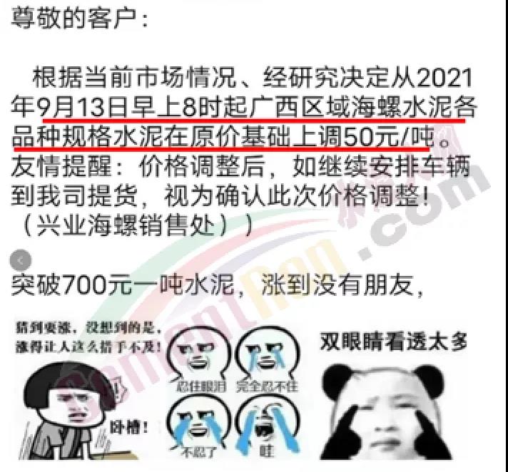 興業(yè)海螺銷售處通知,根據(jù)當(dāng)前市場情況,經(jīng)研究決定從9月15日中午12時起廣西區(qū)域海螺水泥各品種規(guī)格水泥上調(diào)100元/噸。前一日曾通知自9月13日早8時起,廣西區(qū)域海螺水泥各品種規(guī)格水泥在原價基礎(chǔ)上上調(diào)50元/噸。經(jīng)銷商表示,即將漲到800元/噸,漲到?jīng)]朋友了!