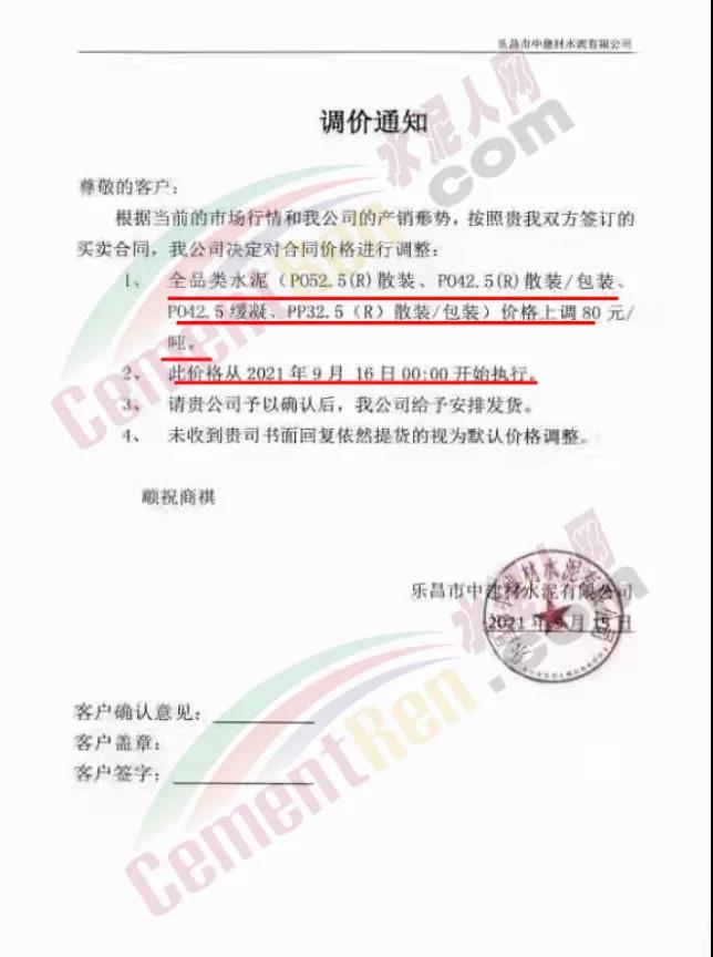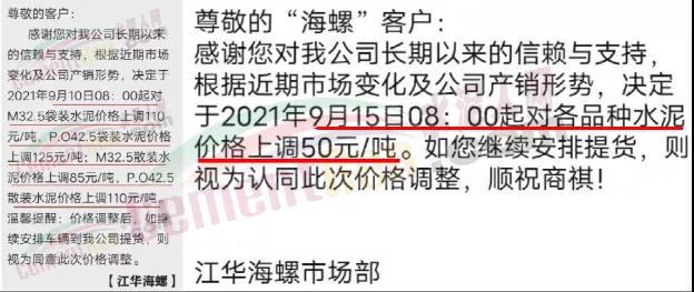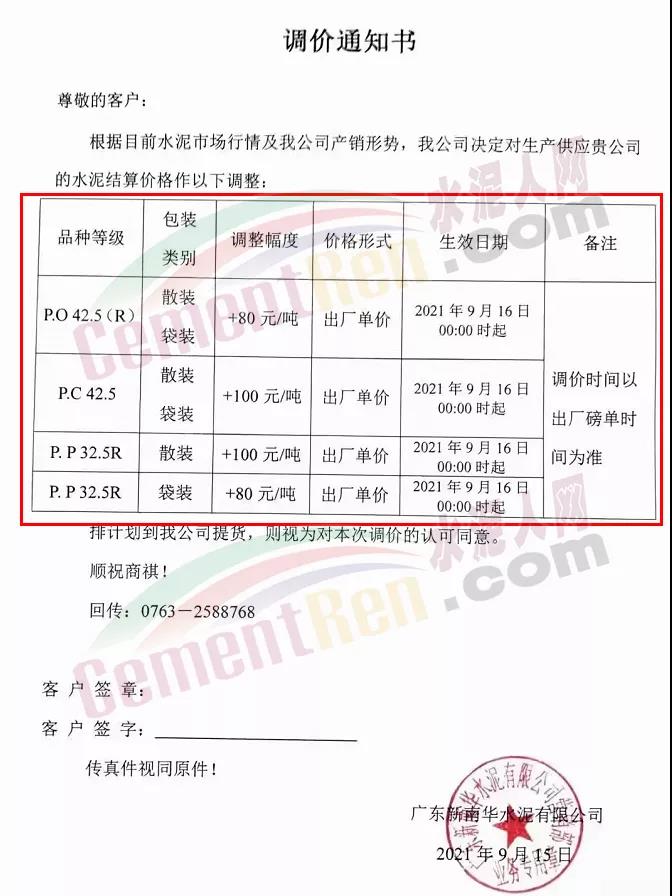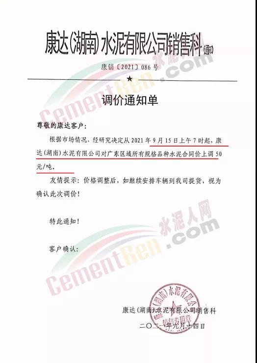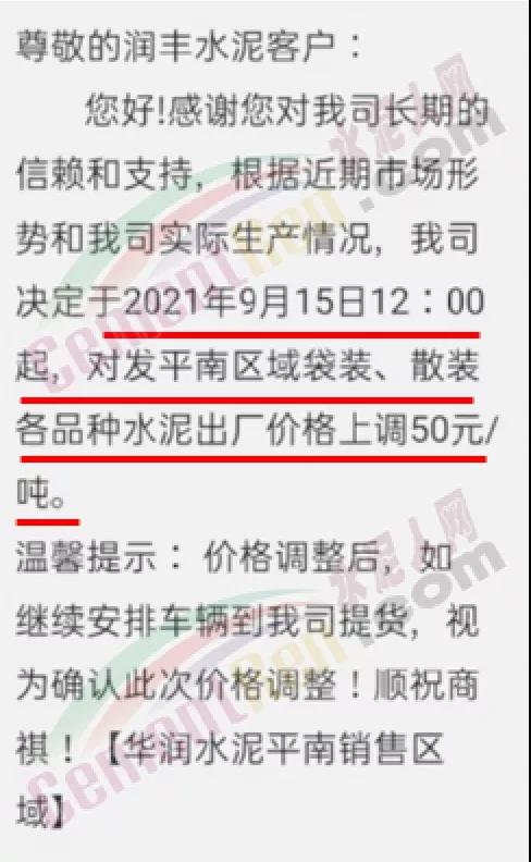 華潤水泥平南銷售區(qū)域通知,根據(jù)近期市場形勢和公司實際生產(chǎn)情況,決定于2021年9月15日12時起,對發(fā)平南區(qū)域袋裝、散裝各品種水泥出廠價格上調(diào)50元/噸。