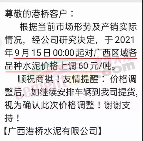 廣西港泥通知,自9月15日起對廣西區(qū)域各品種水泥上調(diào)60元/噸。