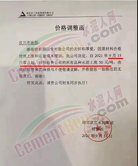 湖北京蘭水泥通知9月15日零時起,所有品種水泥上漲50元/噸。