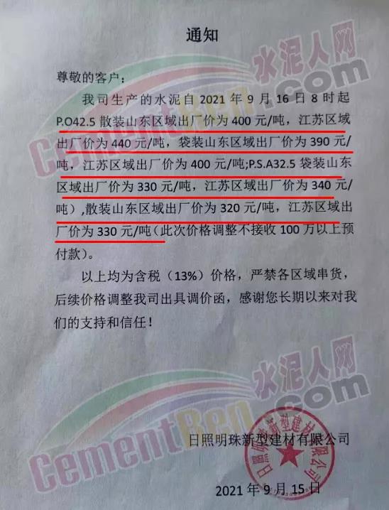 日照明珠新型建材有限公司通知自9月16日8時起P.O42.5散裝山東區(qū)域出廠價為400元/噸,江蘇區(qū)域出廠價為440元/噸,袋裝山東區(qū)域出廠價為390元/噸,江蘇區(qū)域出廠價為400元/噸;PS.A32.5袋裝山東區(qū)域出廠價為330元/噸,江蘇區(qū)域出廠價為340元/噸,散裝山東區(qū)域出廠價為320元/噸,江蘇區(qū)域出廠價為330元/噸(此次價格調(diào)整不接收100萬以上預(yù)付款)。