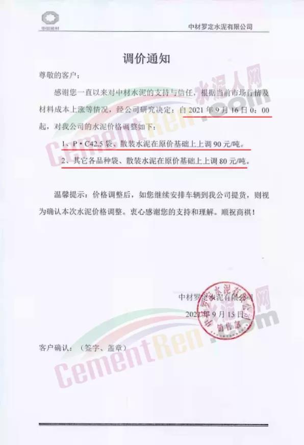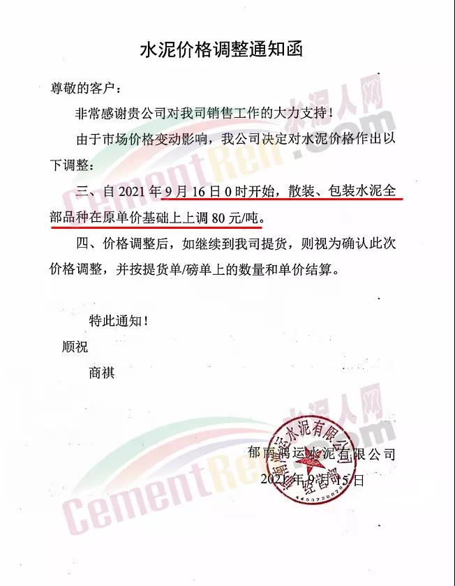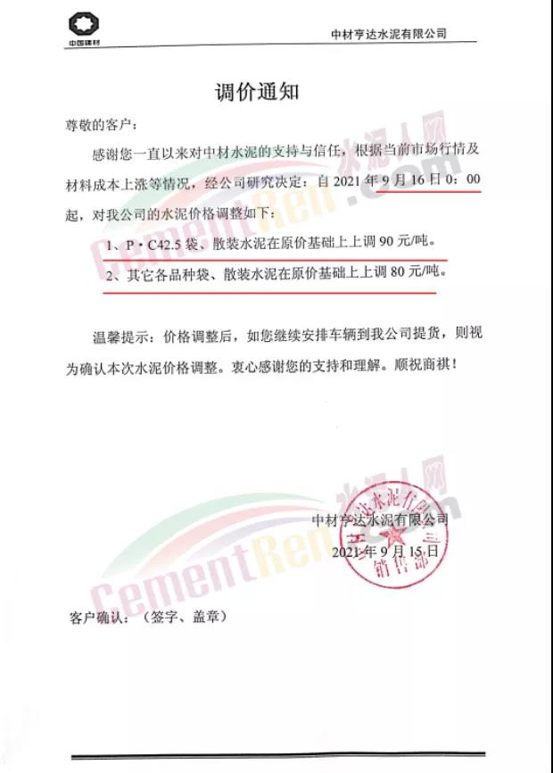 中材亨達(dá)水泥有限公司通知,9月16日0時起P.C42.5袋、散裝水泥上調(diào)90元/噸。其他各品種袋裝、散裝水泥上調(diào)80元/噸。