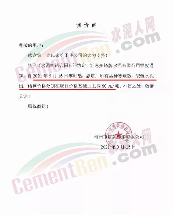 梅州市塔牌水泥通知自9月16日0時起,惠塔廠所有品種水泥上調(diào)80元/噸。