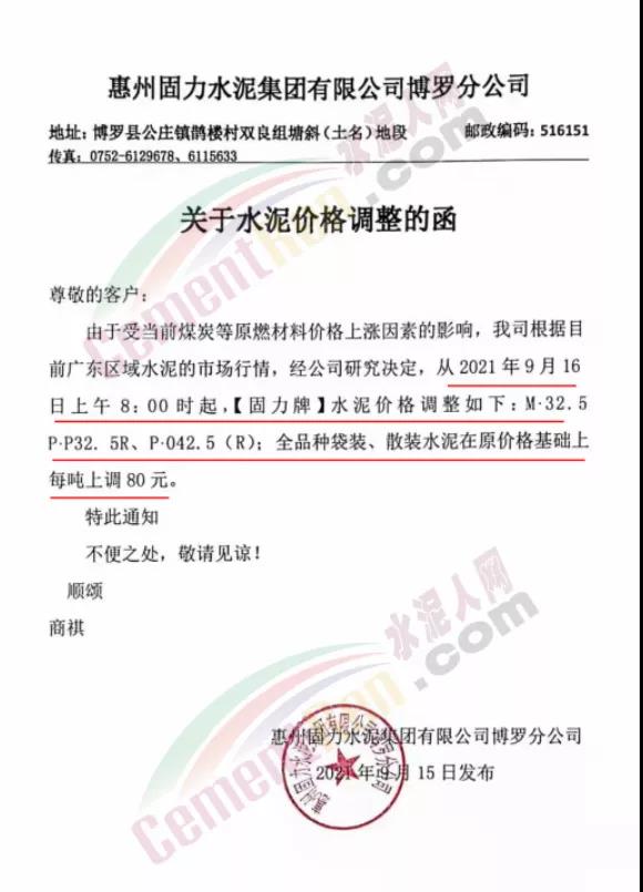 惠州固力水泥集團有限公司博羅分公司通知,9月16日上午8時起各標(biāo)號水泥上調(diào)80元/噸。