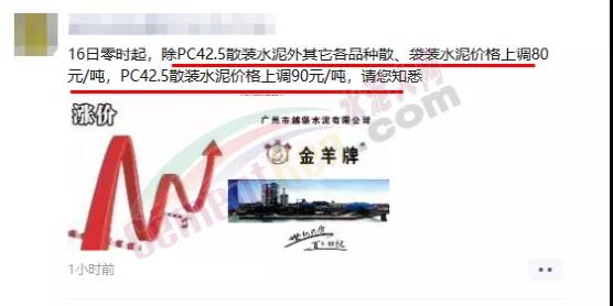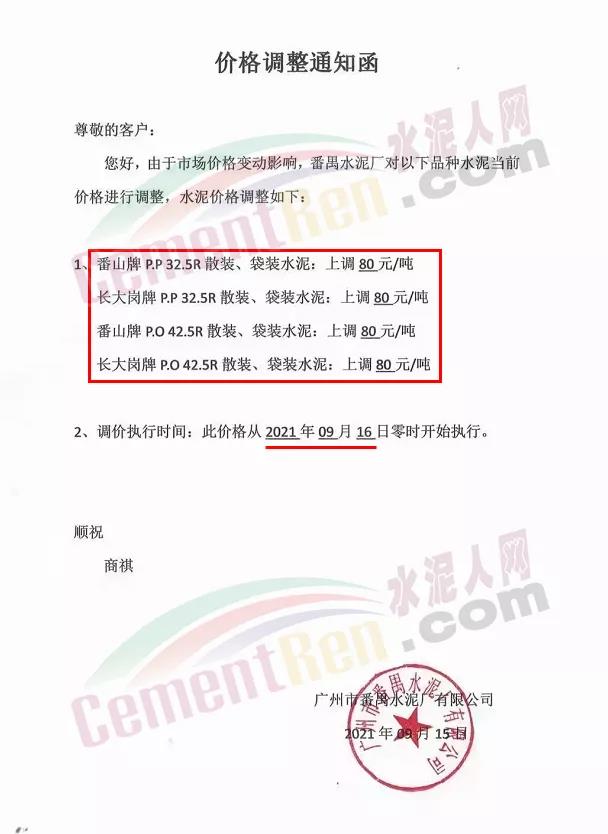 廣州市番禺水泥廠通知自9月16日起各標(biāo)號水泥上調(diào)80元/噸。