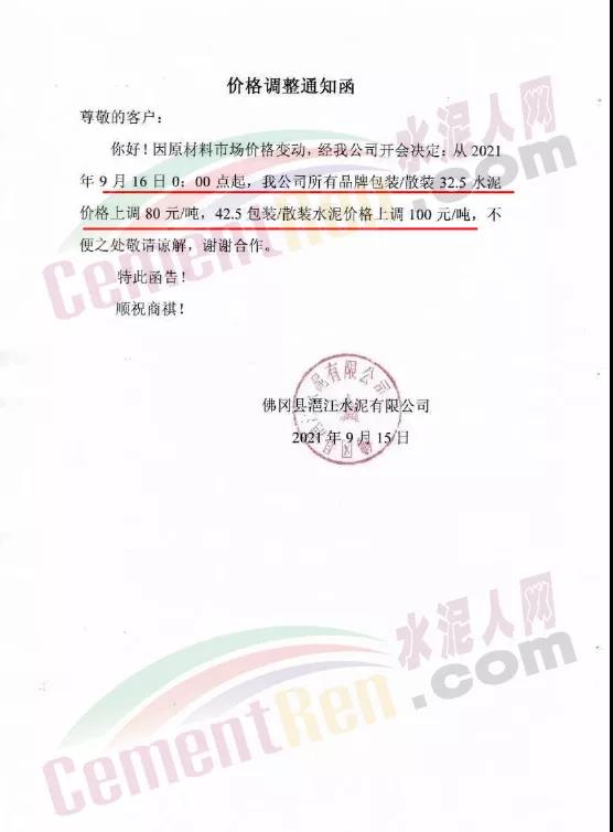 佛岡縣潖江水泥有限公司通知9月16日0時起,公司所有包裝/散裝32.5水泥價格上調(diào)80元/噸,42.5包裝/散裝水泥價格上調(diào)100元/噸。
