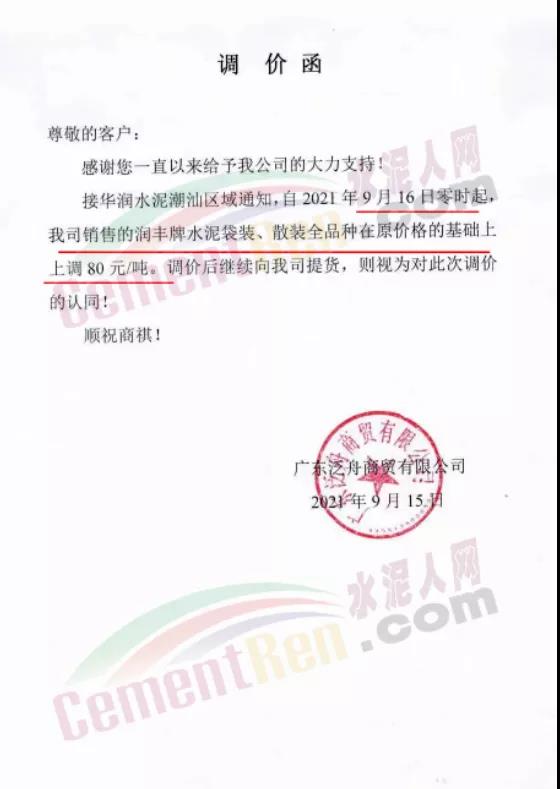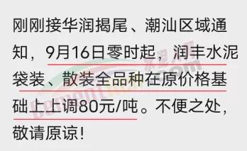 華潤揭尾、潮汕區(qū)域通知,9月16日零時起,潤豐水泥袋裝、散裝全品種在原價格基礎(chǔ)上上調(diào)80元/噸。