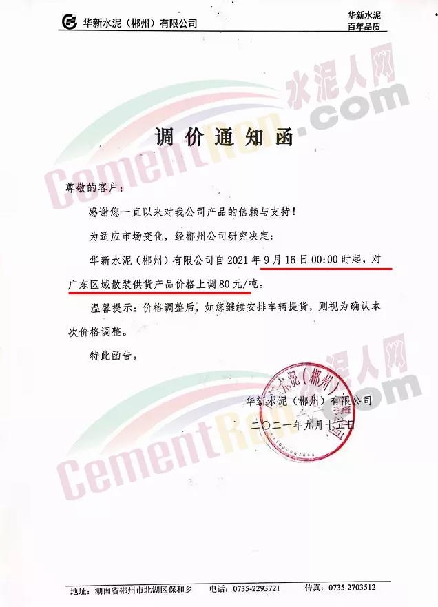 華新水泥(郴州)有限公司通知,9月16日0時起,對廣東區(qū)域散裝供貨價上調(diào)80元/噸。